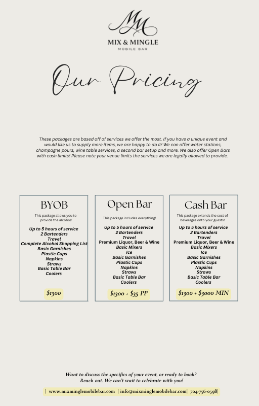 Choose mix&minglemobilebar.com for a mobile bartending experience that combines expertise, elegance, and unparalleled service. We're more than just drinks; we're about creating joyous, lasting memories. Let us bring the perfect pour to your next celebration.